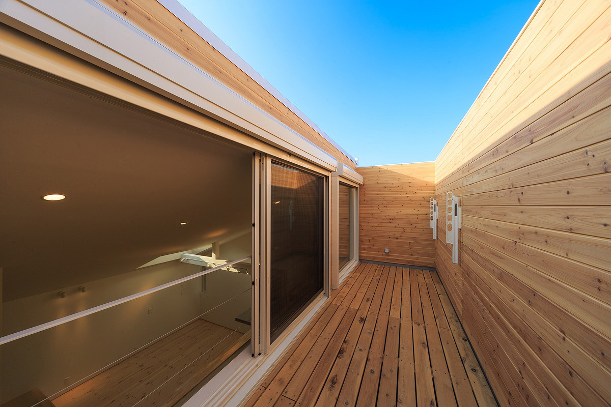 外部とほどよくつながる、木の温もりを感じるデッキスペース。