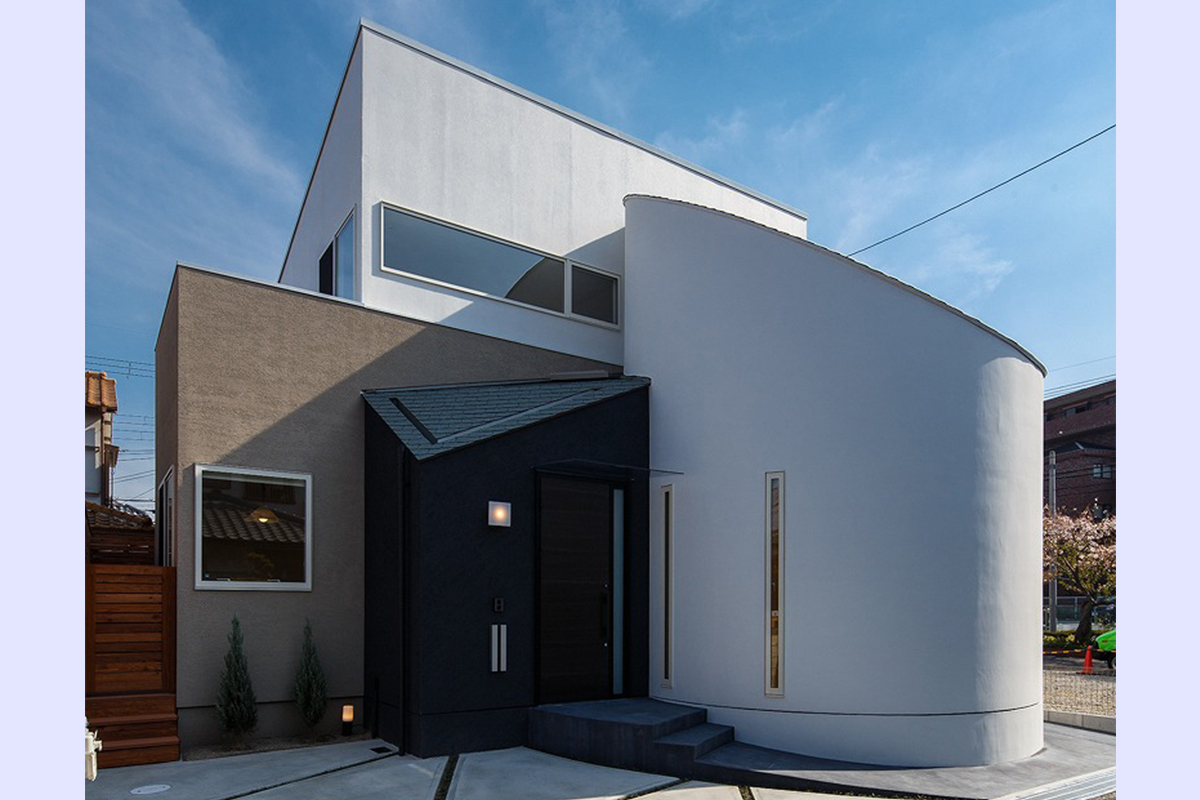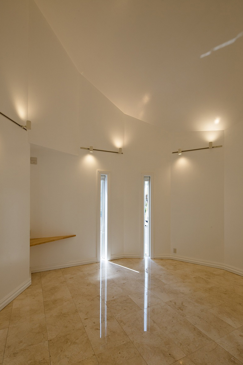 外観は大きな円弧の壁が象徴的で、やわらかな曲線がまるで音の広がりを表現しているかのよう。内部の音楽室は高さのある天井と細長い開口により、光と音がやさしく巡る心地よい空間に仕上げられています。