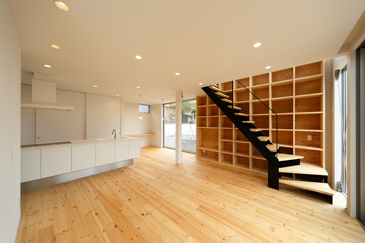 ガルバリウムのシンプルなデザイン。LDKは明るく開放的で、本も楽しく素敵に収納できる家。