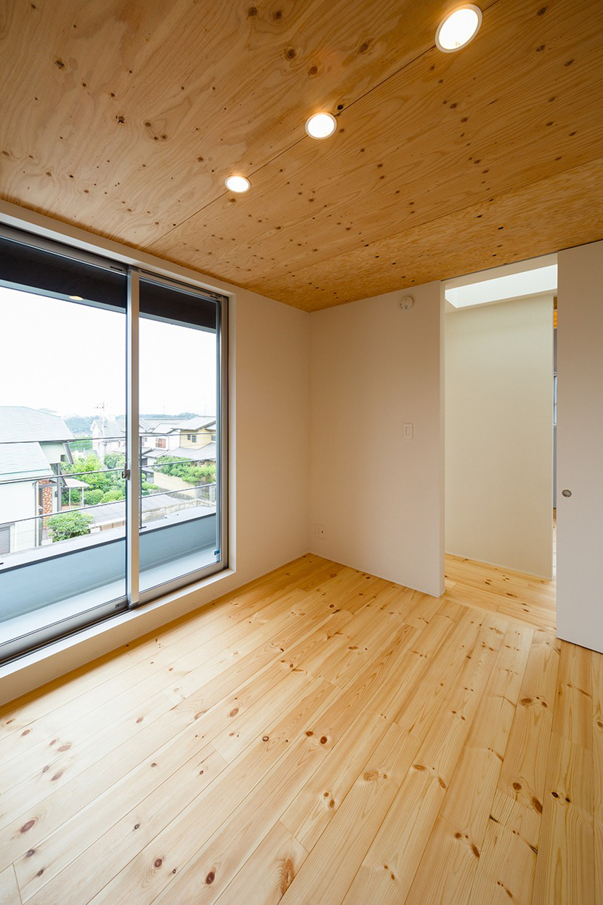 木のぬくもりを感じる床と天井。シンプルな空間だからこそ、素材の表情が引き立つ居室。