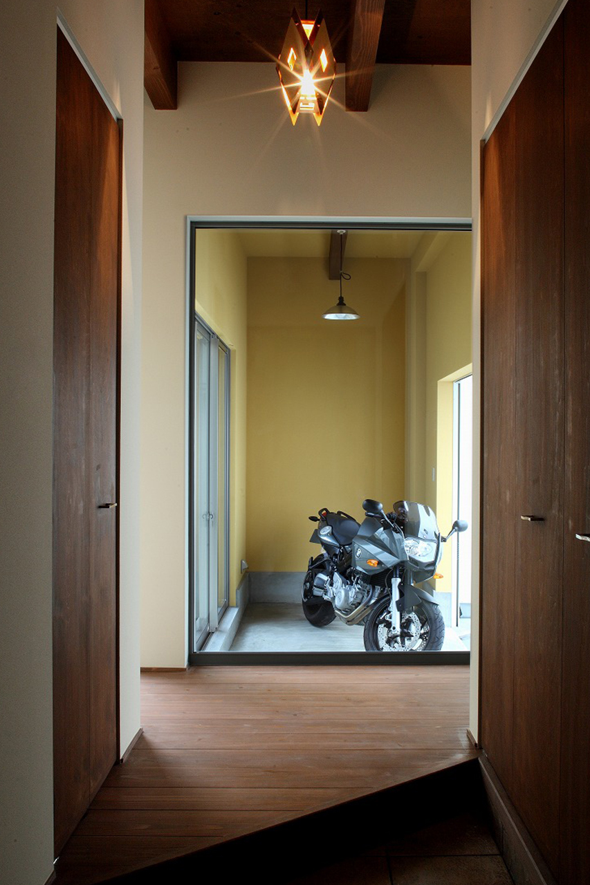 玄関の奥には、バイクをディスプレイできる土間スペースを設計。