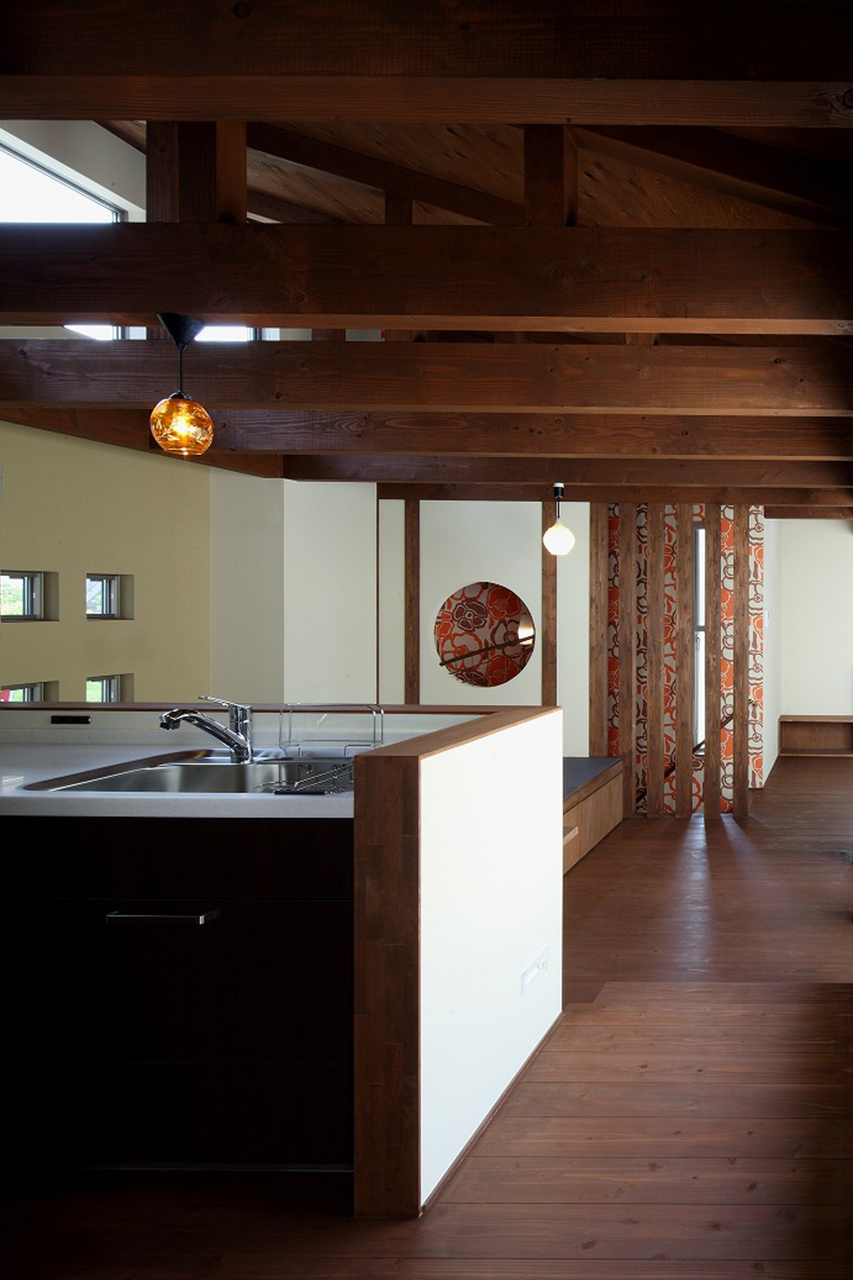 濃色の梁と床材がつくる落ち着いた空間。