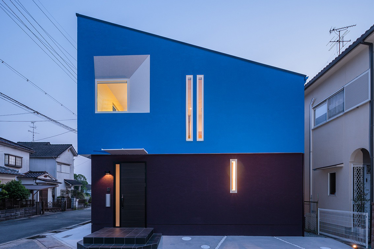 鮮やかなブルーの外壁は、見る位置や時間によって陰影が移ろい、まるで建物自体が立体的に浮き上がるような存在感を放ちます。