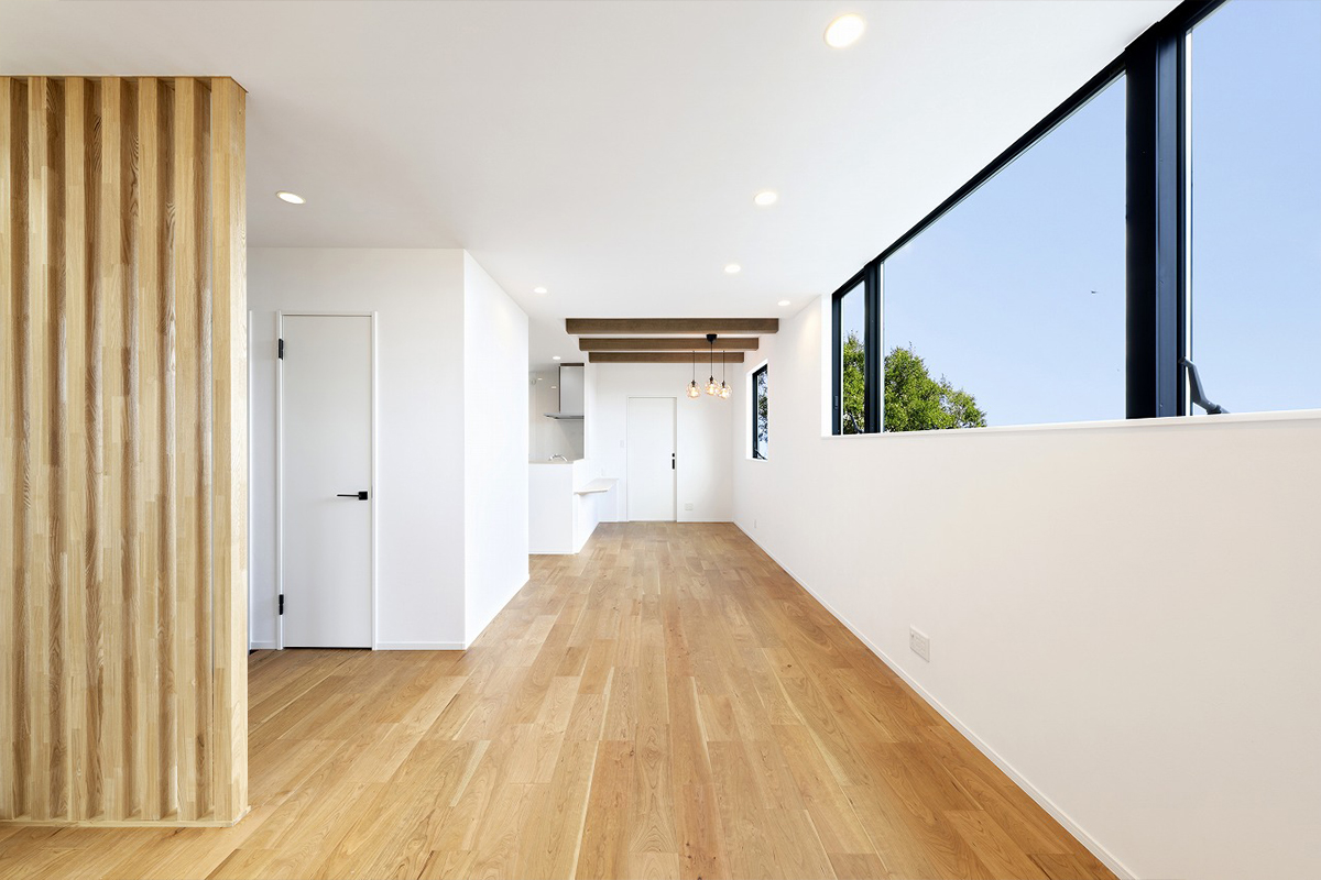 道路や隣家からの視線を自然に遮りながらも、室内には大きな開口部から光と景色が広がり、心地よい開放感を感じられる空間に。