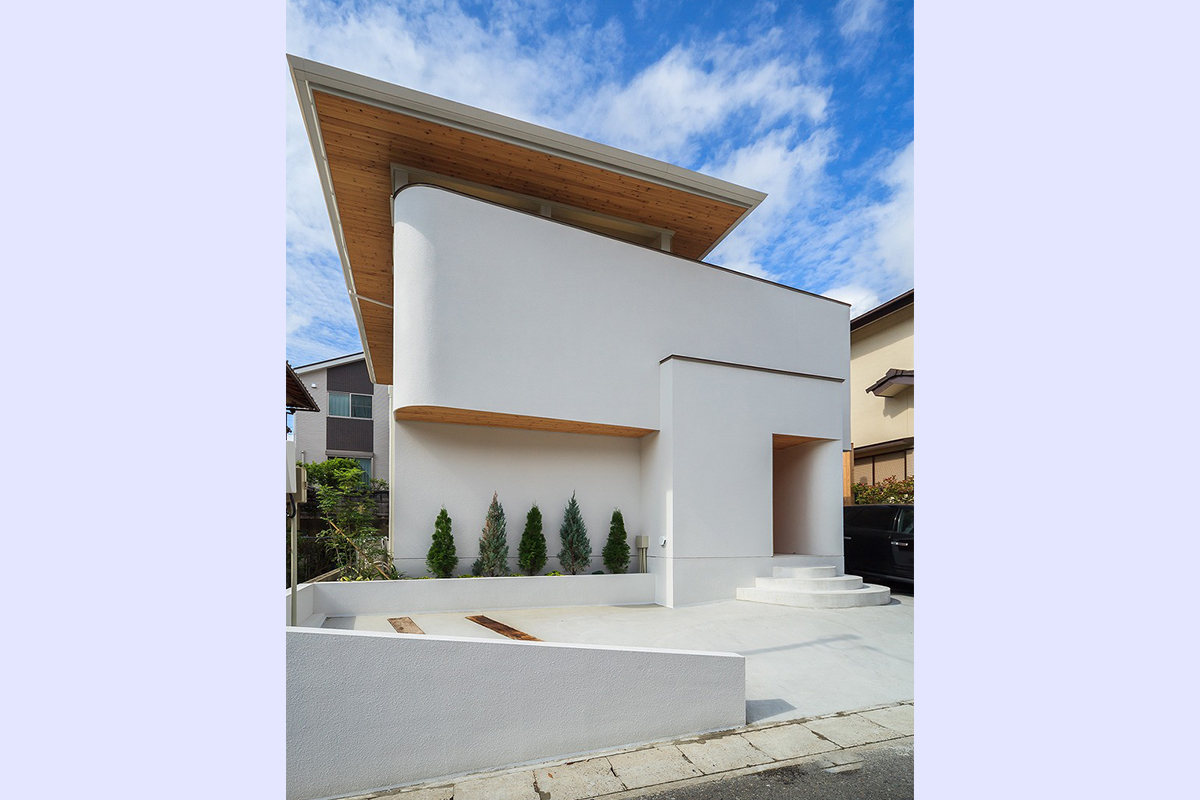 やさしい曲線で構成された外観と、木の質感が映える大きな屋根が印象的な住まいです。