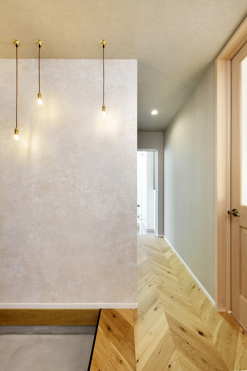 床材の張り方向や照明計画により、LDKへ誘うような奥行きとリズムを感じる玄関ホール。