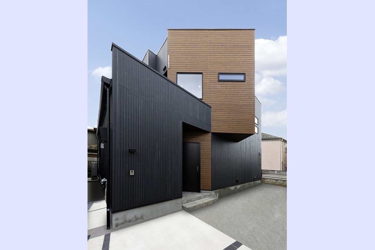 外観はダークトーンをベースに、木目アクセントを組み合わせたスタイリッシュなファサード。