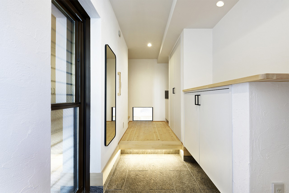 玄関から続く落ち着いた動線は、外と内の切り替えを穏やかに演出。