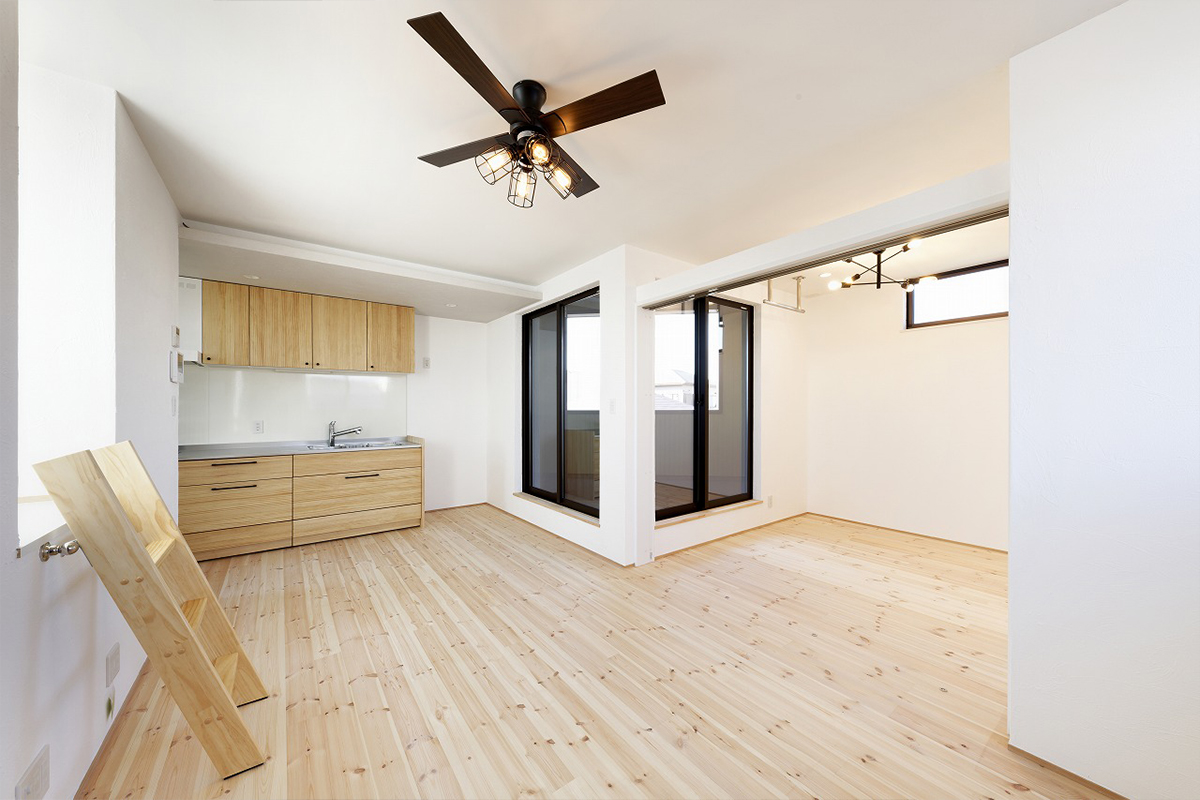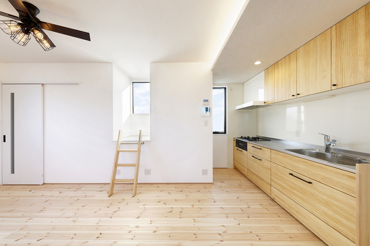 最上階に配置したLDKは、無垢フロアの温かみが広がるくつろぎの空間。