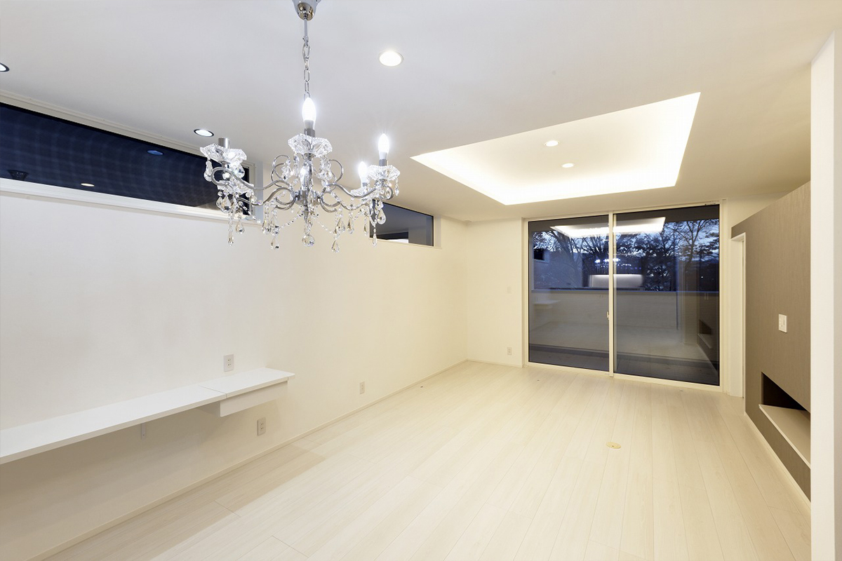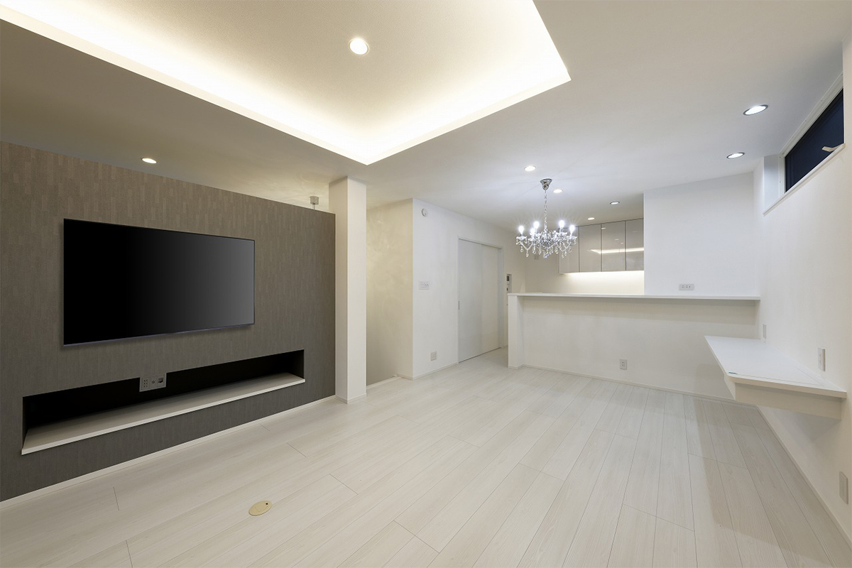 ホワイトを基調とした明るいLDKに、窓から見える緑の景色が溶け込み、室内に奥行きとくつろぎをもたらします。
