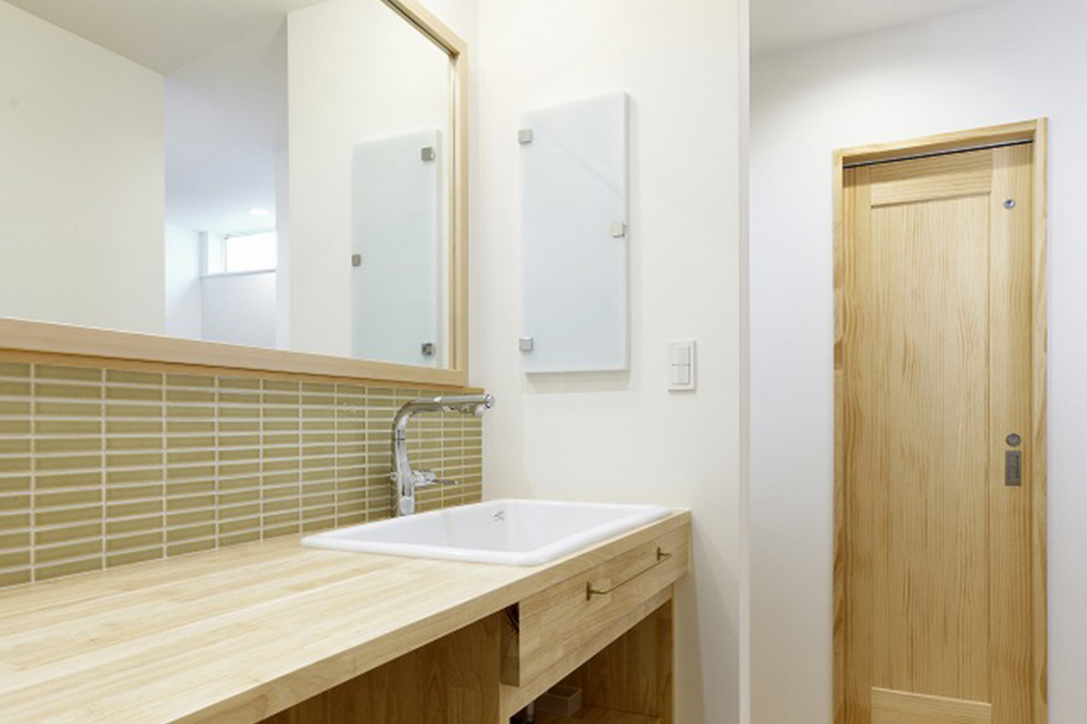 広い鏡と木のカウンターが、朝の支度をゆったりとした時間に変えてくれる洗面。