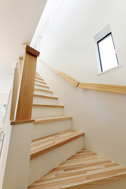 無垢材の階段に、吹き抜けから落ちる自然光がそっと重なる。