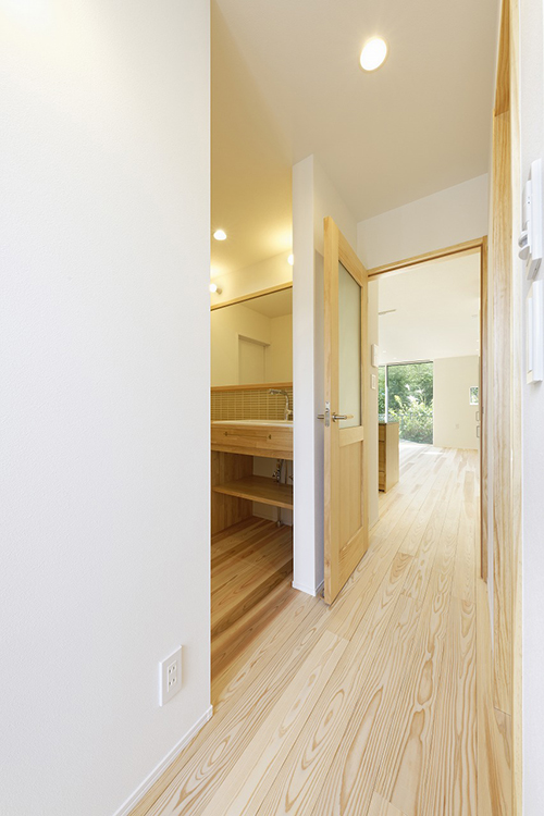 洗面から廊下、そしてLDKへと続く動線は、どこにいても無垢材のぬくもりを感じられるやさしい空気感に包まれています。