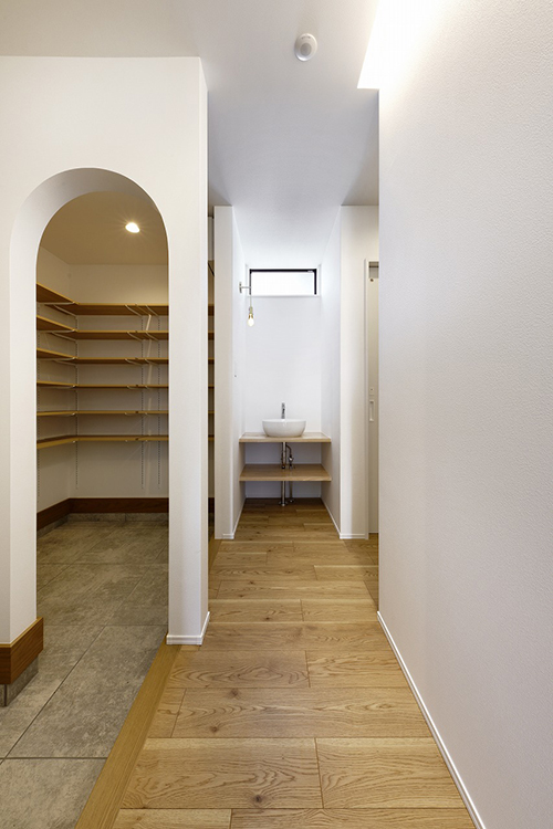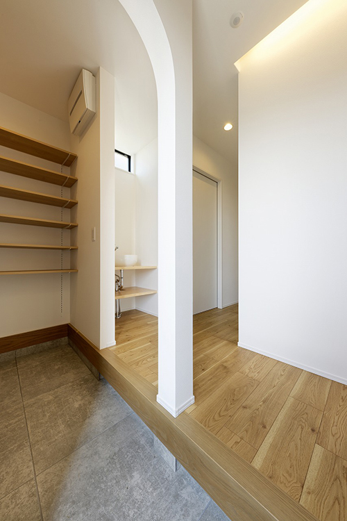 アーチの奥に続く土間収納は、靴や遊び道具、猫のグッズまで気持ちよく収まる“迎え入れゾーン”。