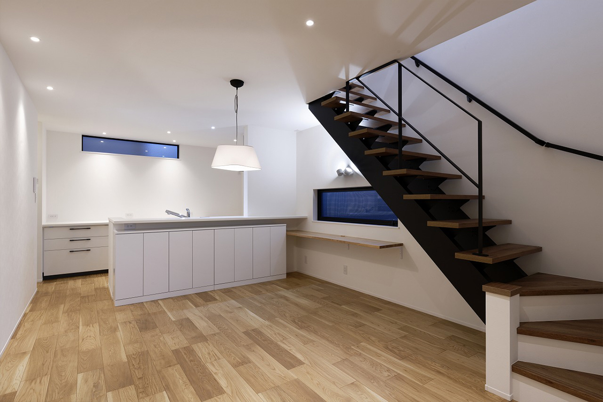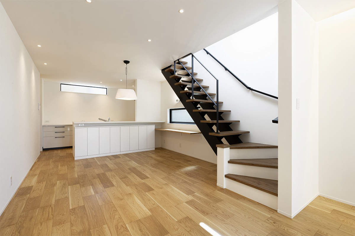 オープン階段を採用することで、視線を遮らず空間に奥行きを持たせました。明るい木目の床と白い壁が、日差しを柔らかく拡散させます。