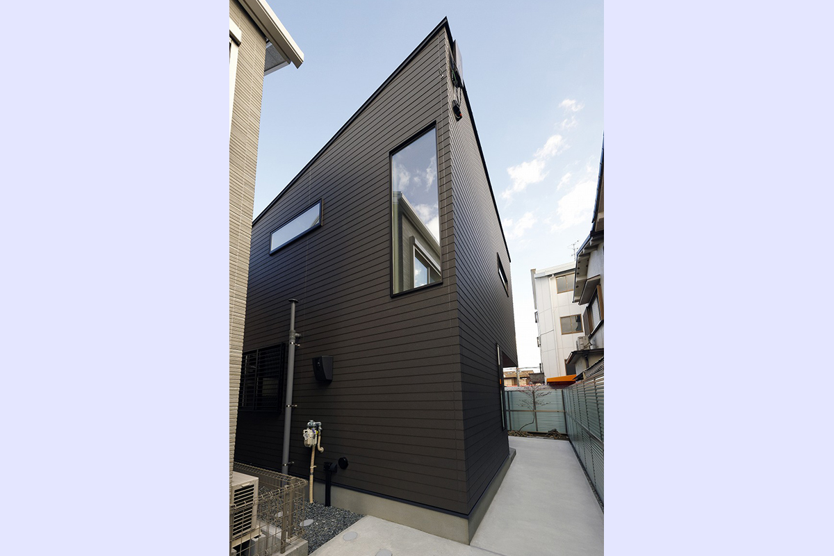 周囲の街並みにやさしく溶け込む、落ち着いた外観が印象的なコンパクトハウス。