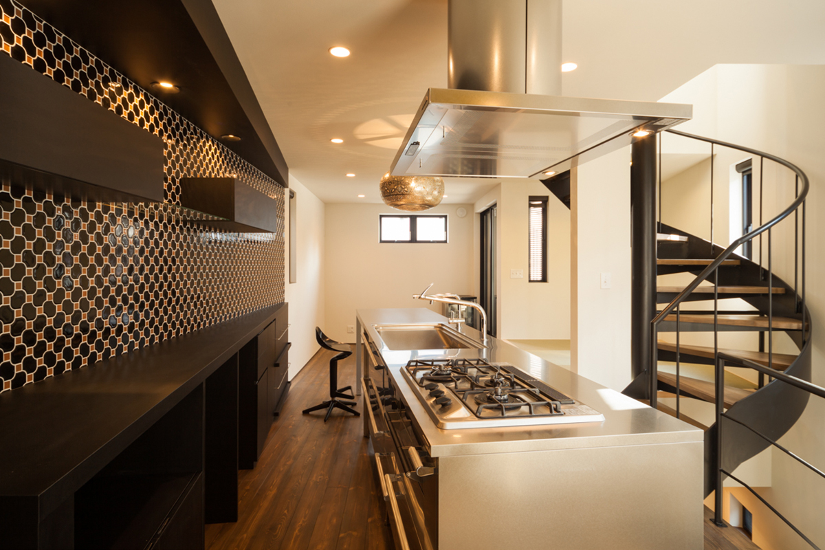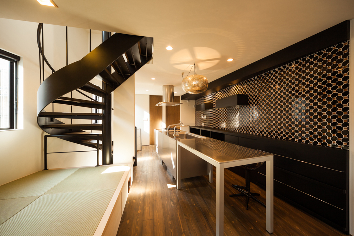 外観は直線を活かしたシンプルなフォルムでありながら、内部に入ると曲線が美しい螺旋階段が視線を引き込み、空間全体に動きとデザイン性をもたらします。