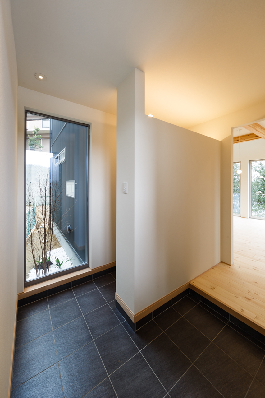 玄関まわりにも無垢材を取り入れ、帰宅した瞬間からぬくもりを感じられる空間に。
