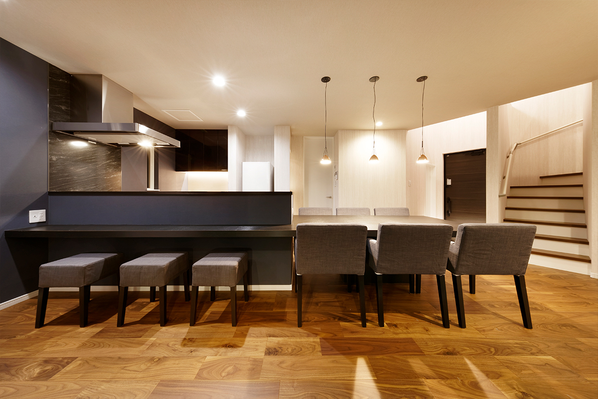 広がりを持たせたLDKは、大人数で集まっても心地よく過ごせるゆとりある空間構成。