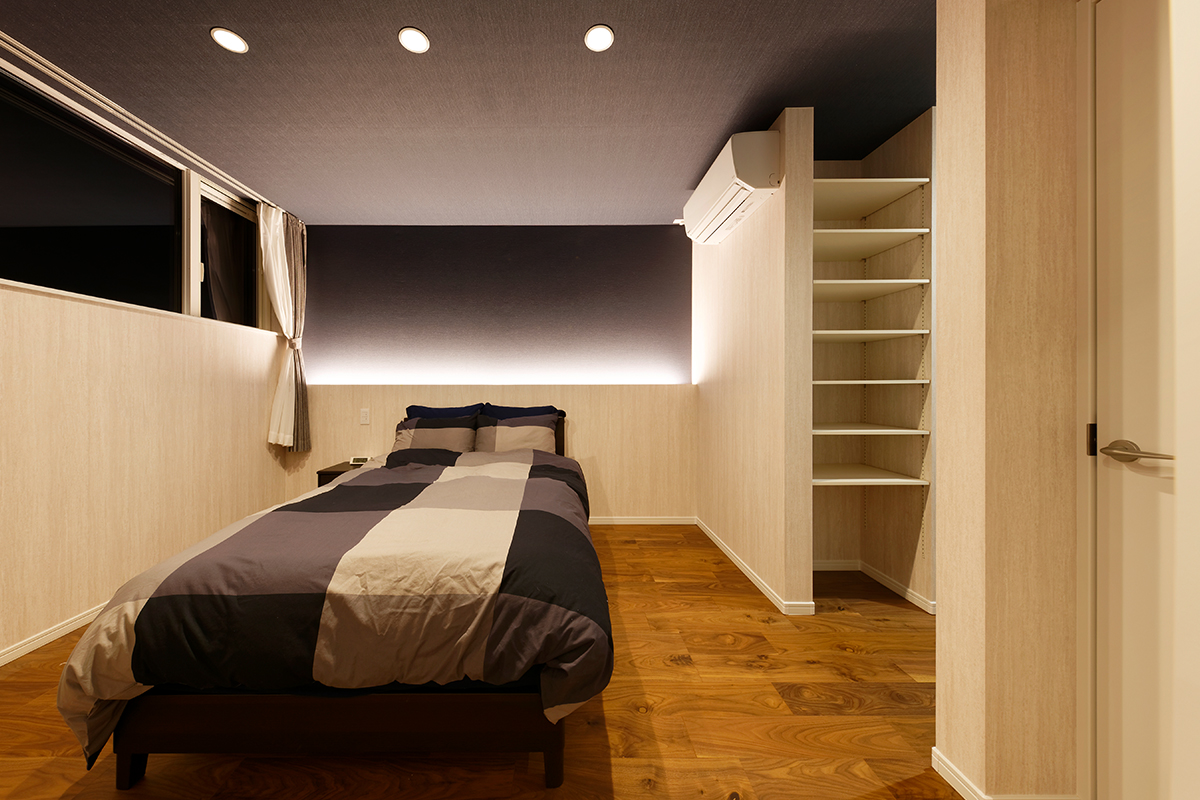 落ち着いたトーンで整えた、静かにくつろげるベッドルーム。